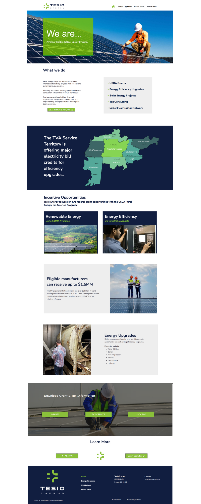 Tesio Energy is a clean technology consultancy helping manufacturers across the Tennessee Valley Authority region modernize operations through grant-funded cleaner energy initiatives. I led Tesio's website development and brand implementation under the PBMA umbrella, after personally bringing the client into the agency through a coworking network connection.